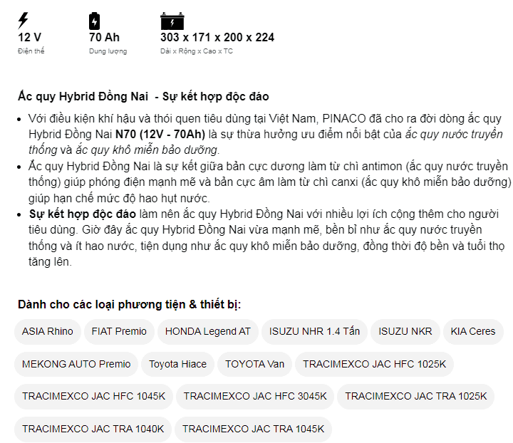 Ắc quy Đồng Nai nước 12V-70Ah (N70)