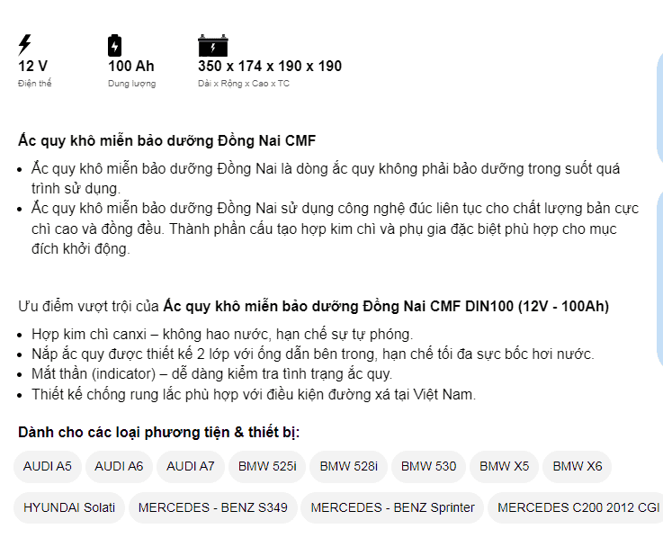 Dòng CMF là ắc quy miễn bảo dưỡng (ắc quy khô, kín) của Đồng Nai đảm bảo về chất lượng cũng như giá thành sản phẩm. Ắc quy làm từ hợp kim chì canxi có bổ sung thiếc, bạc nhập khẩu từ Úc nên không hao nước, hạn chế sự tự phóng điện. Nắp bình được thiết kế 2 lớp với ống dẫn bên trong, giúp giảm tối đa sự bốc hơi nước. Trong bình trang bị bộ phận lọc chống bắt lửa – an toàn khi sử dụng và Indicator (mắt thần) – dễ dàng kiểm tra tình trạng ắc quy.