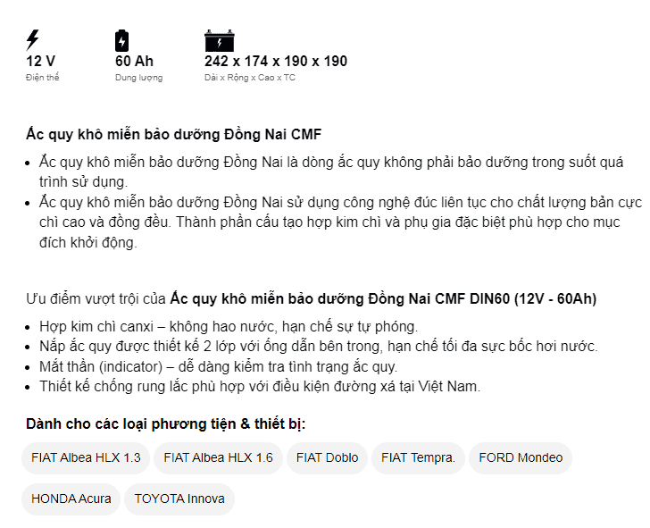 Dòng CMF là ắc quy miễn bảo dưỡng (ắc quy khô, kín) của Đồng Nai đảm bảo về chất lượng cũng như giá thành sản phẩm. Ắc quy làm từ hợp kim chì canxi có bổ sung thiếc, bạc nhập khẩu từ Úc nên không hao nước, hạn chế sự tự phóng điện. Nắp bình được thiết kế 2 lớp với ống dẫn bên trong, giúp giảm tối đa sự bốc hơi nước. Trong bình trang bị bộ phận lọc chống bắt lửa – an toàn khi sử dụng và Indicator (mắt thần) – dễ dàng kiểm tra tình trạng ắc quy.
