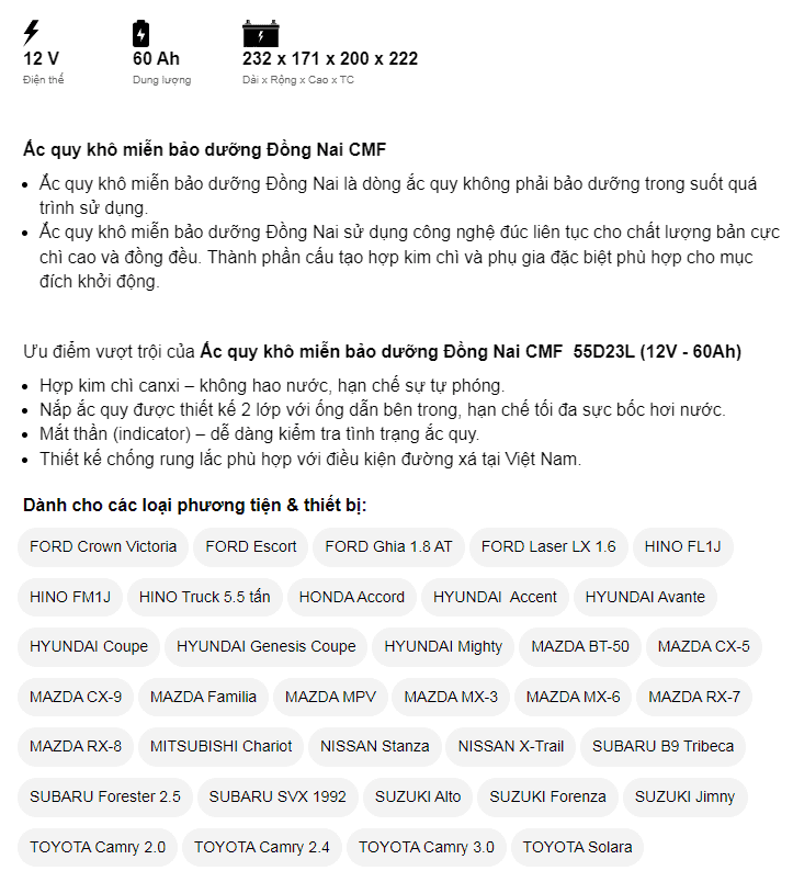 Dòng CMF là ắc quy miễn bảo dưỡng (ắc quy khô, kín) của Đồng Nai đảm bảo về chất lượng cũng như giá thành sản phẩm. Ắc quy làm từ hợp kim chì canxi có bổ sung thiếc, bạc nhập khẩu từ Úc nên không hao nước, hạn chế sự tự phóng điện. Nắp bình được thiết kế 2 lớp với ống dẫn bên trong, giúp giảm tối đa sự bốc hơi nước. Trong bình trang bị bộ phận lọc chống bắt lửa – an toàn khi sử dụng và Indicator (mắt thần) – dễ dàng kiểm tra tình trạng ắc quy.