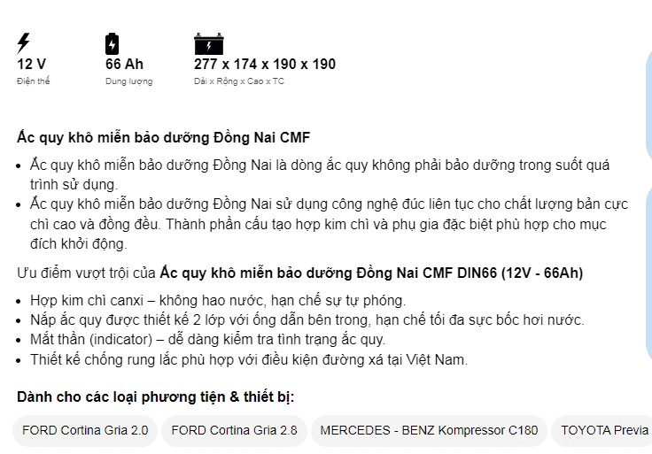 Dòng CMF là ắc quy miễn bảo dưỡng (ắc quy khô, kín) của Đồng Nai đảm bảo về chất lượng cũng như giá thành sản phẩm. Ắc quy làm từ hợp kim chì canxi có bổ sung thiếc, bạc nhập khẩu từ Úc nên không hao nước, hạn chế sự tự phóng điện. Nắp bình được thiết kế 2 lớp với ống dẫn bên trong, giúp giảm tối đa sự bốc hơi nước. Trong bình trang bị bộ phận lọc chống bắt lửa – an toàn khi sử dụng và Indicator (mắt thần) – dễ dàng kiểm tra tình trạng ắc quy.