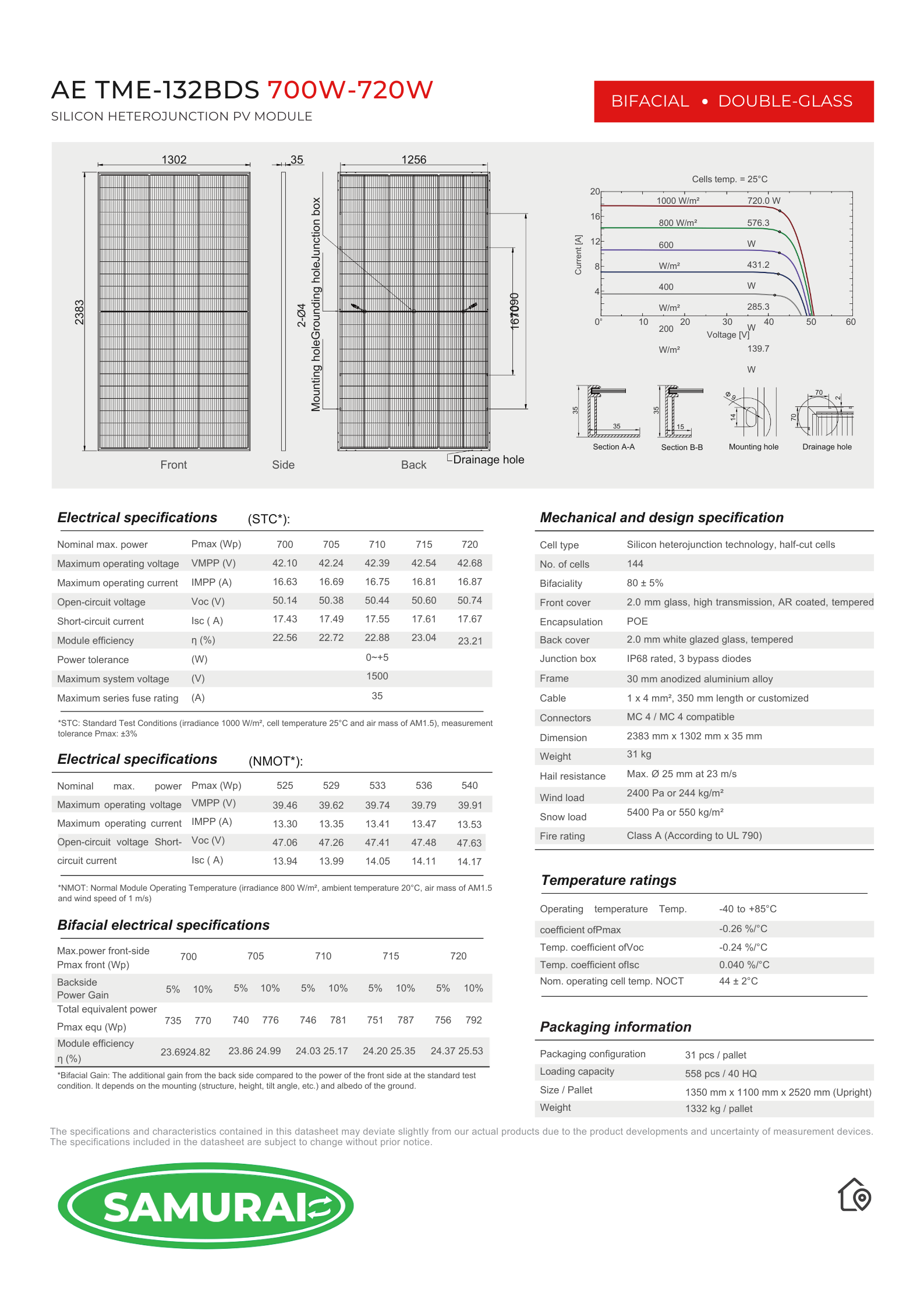 Thông số kỹ thuật tấm pin năng lượng mặt trời Samurai 580W 2 mặt kính N-Type TOPCon